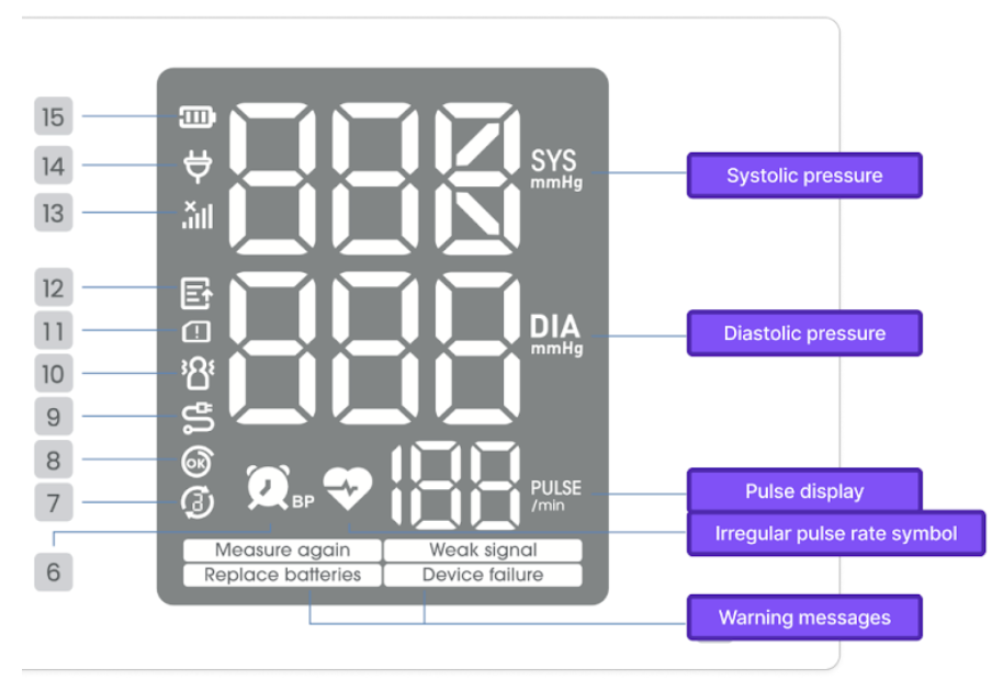 - Your numbers appear on the screen (systolic, diastolic, pulse).